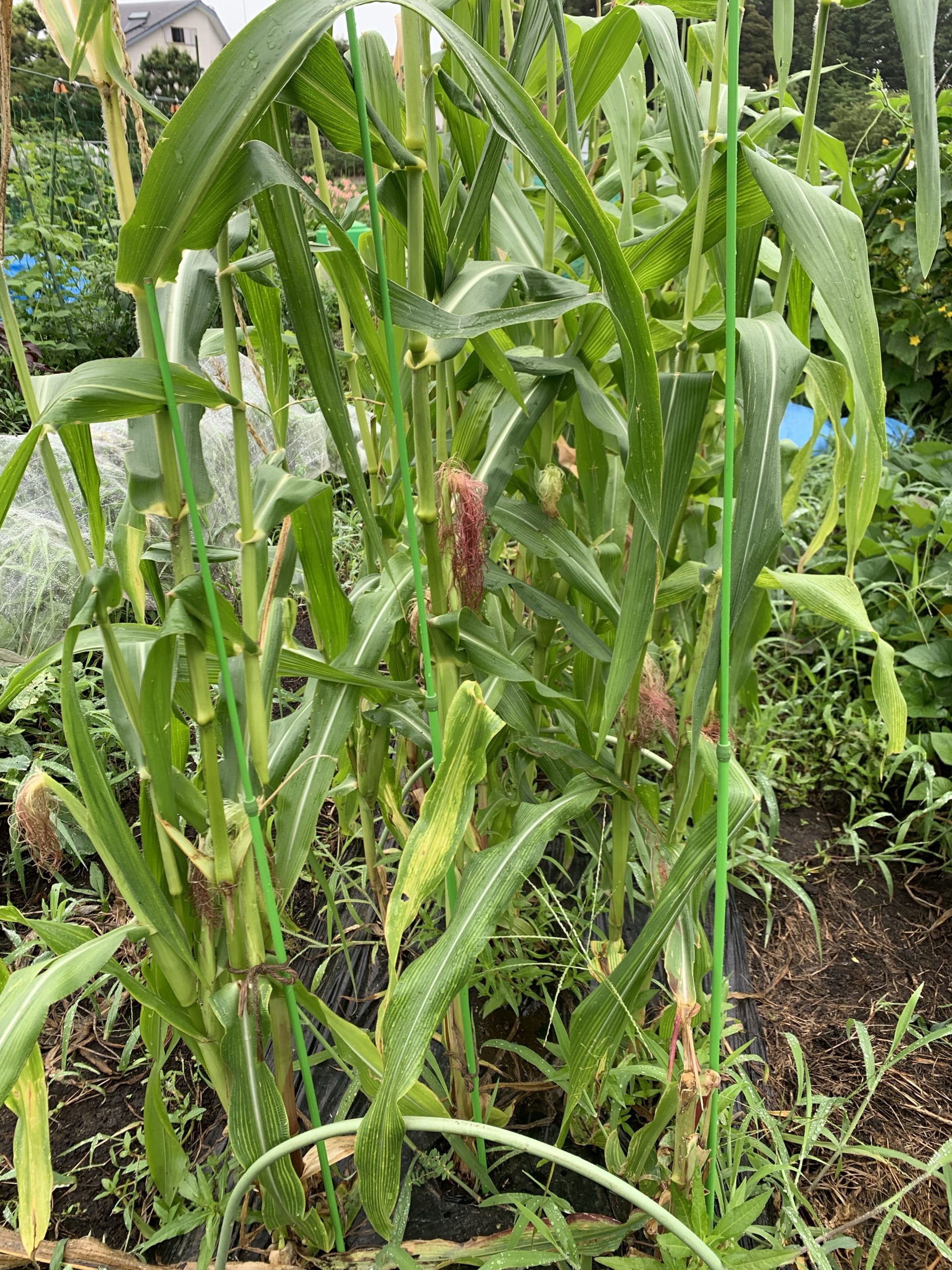 2022.7.6 ヤングコーン収穫、トマト支柱留め、ピーマン大収穫